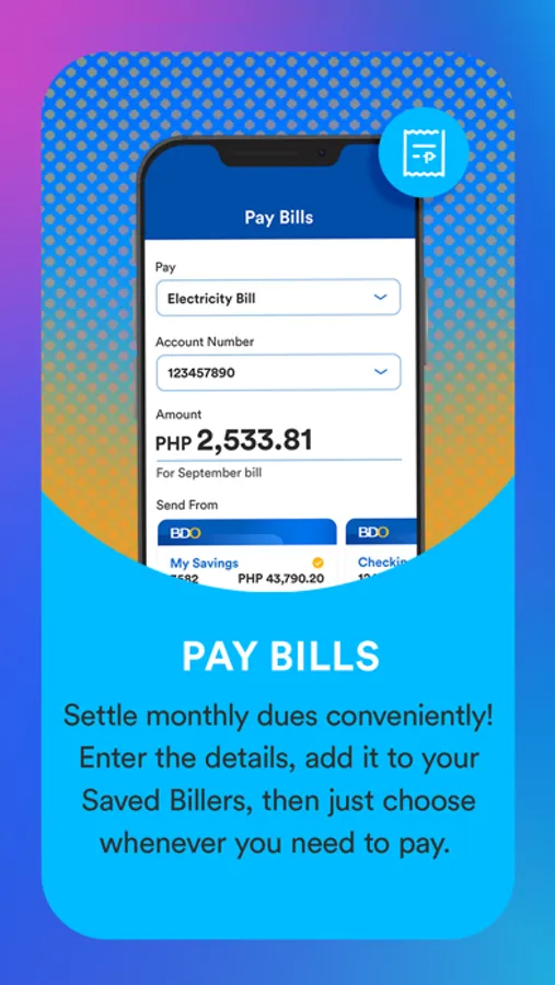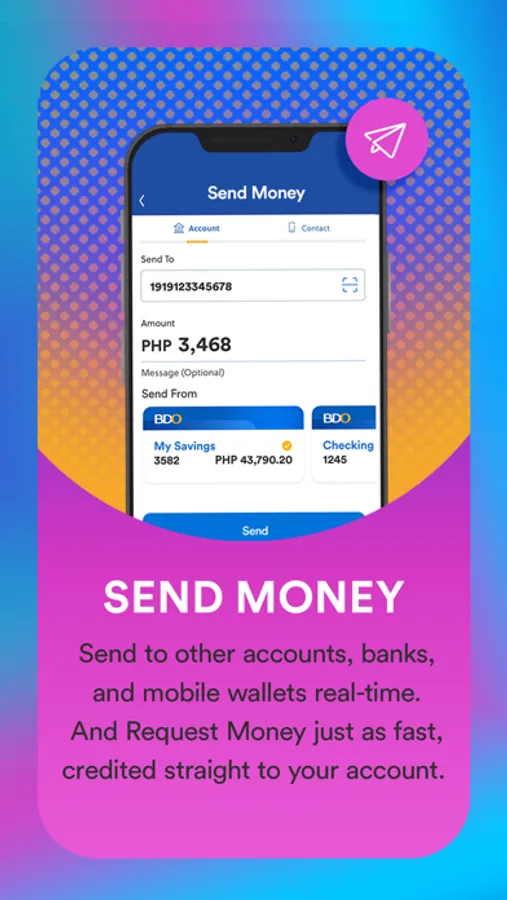 Send Money to other banks and mobile wallets in just a few taps. Just enter your receiver’s details, and Send Money straight from your linked BDO accounts.