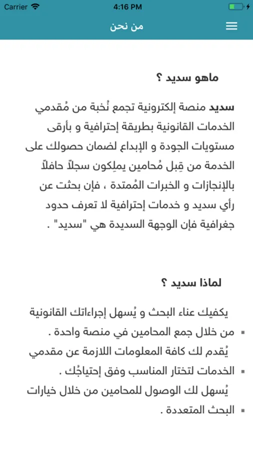 Sadeed is a legal platform application that has elite of service providers with records of achievements and experiences to ensure providing you with the service in a professional manner with the highest quality and creativity.