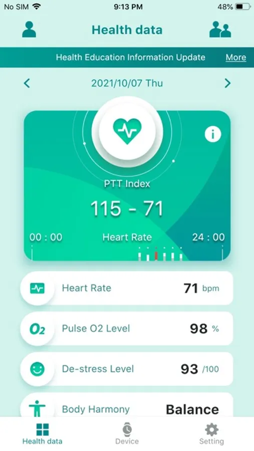 HEALTH INDEX of Heart Rate, Pulse O2 Level, PTT index, Sleep tracking etc., helps you understand and monitor your body and health better.