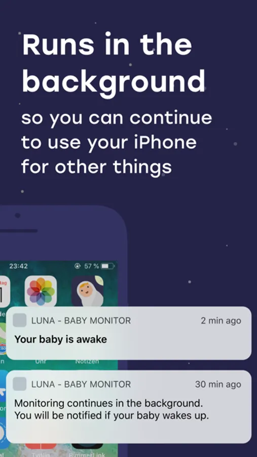 Luna is a multitasker! As opposed to other baby monitor apps, Luna runs reliably without issues in the background. This frees you up to use your mobile device for other things when you need to.