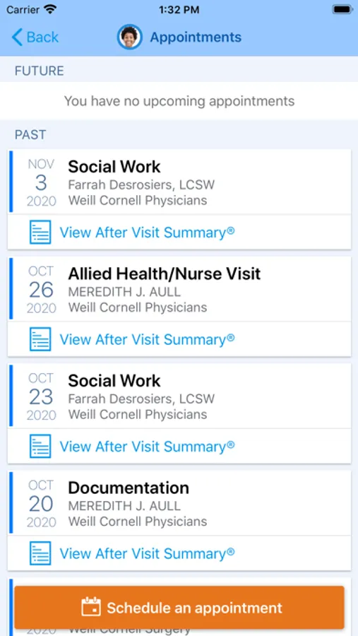 • Manage your appointments: Schedule your next appointment, or view details of your past and upcoming appointments.