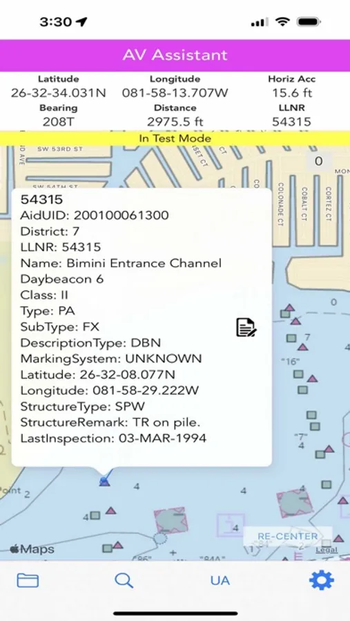AV Assistant is an informational aid for U.S. waters that shows your location and details on all surrounding aids to navigation (buoys, lights, etc) within your Area of Interest. The app downloads the weekly U.S. Coast Guard Light List for your district, and then shows the aids within your Area of Interest and their details. Any applicable Local Notice for Mariners information is also shown with the light data.