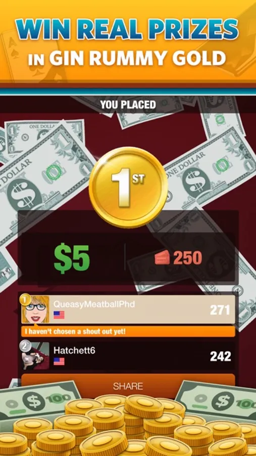 - Compete in daily gin rummy tournaments for a chance to win real world prizes!