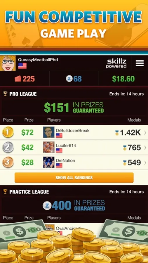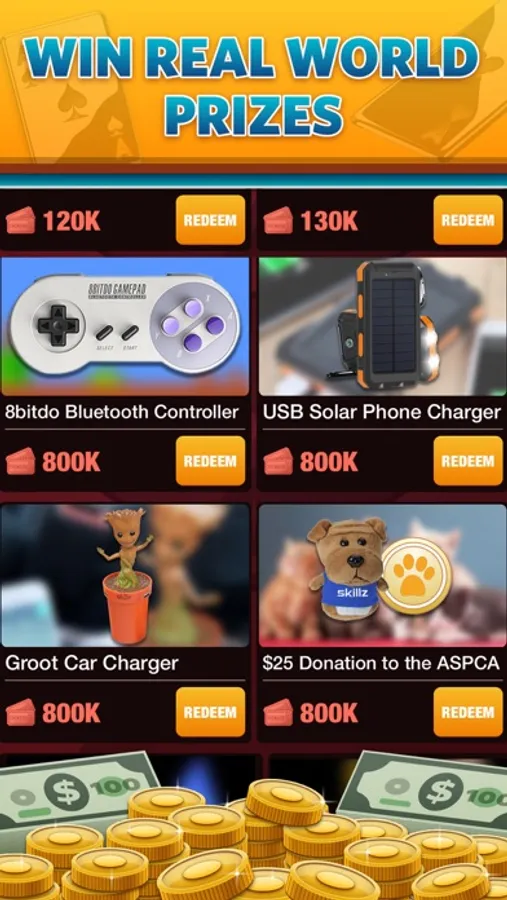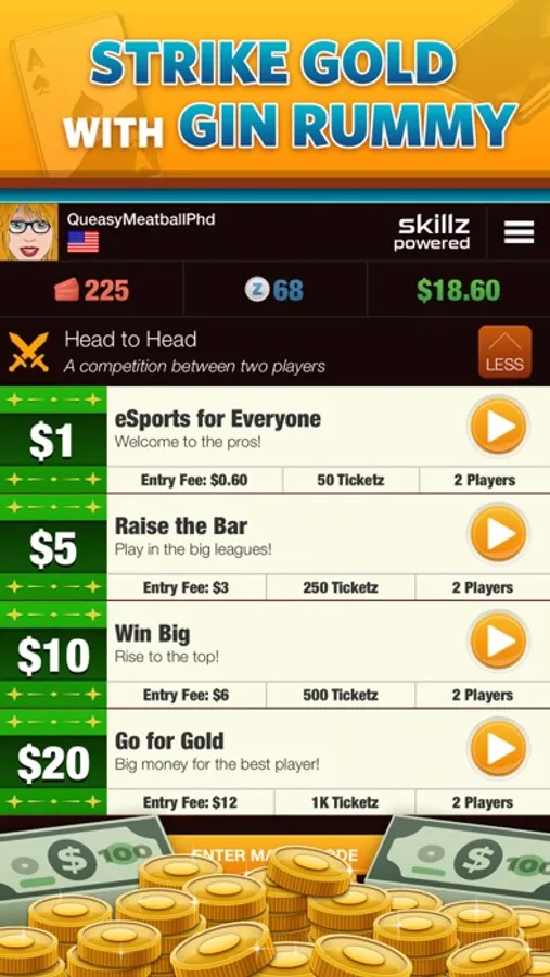 Join the Skillz community and compete in gin rummy tournaments for real world prizes! Best your opponents by scoring the most points first. Play a real person in classic gin rummy; it’s easy. Pick up a card and discard a card to collect the best set. Collect the points left in your opponent’s hand and knock your way to victory. The first one to hit the big score in this classic, simple gin rummy card game wins real prizes!