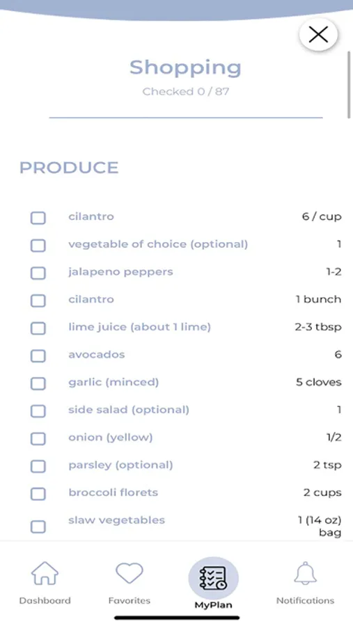 • Intuitive shopping list that auto creates as you select your weekly meals.