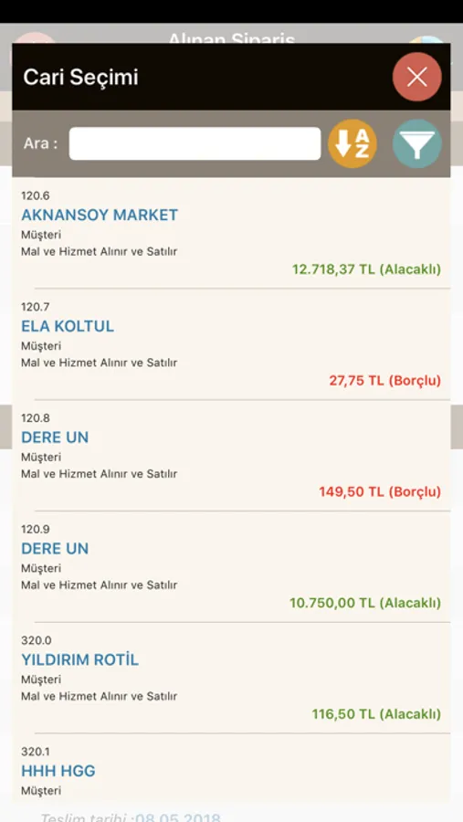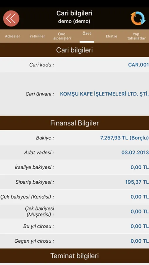 Cari detay ekranında, cari bakiyesi, kredisi, riski, cari hesap ekstresi, önceki siparişleri ve yapılacak tahsilat raporu görüntülenir.