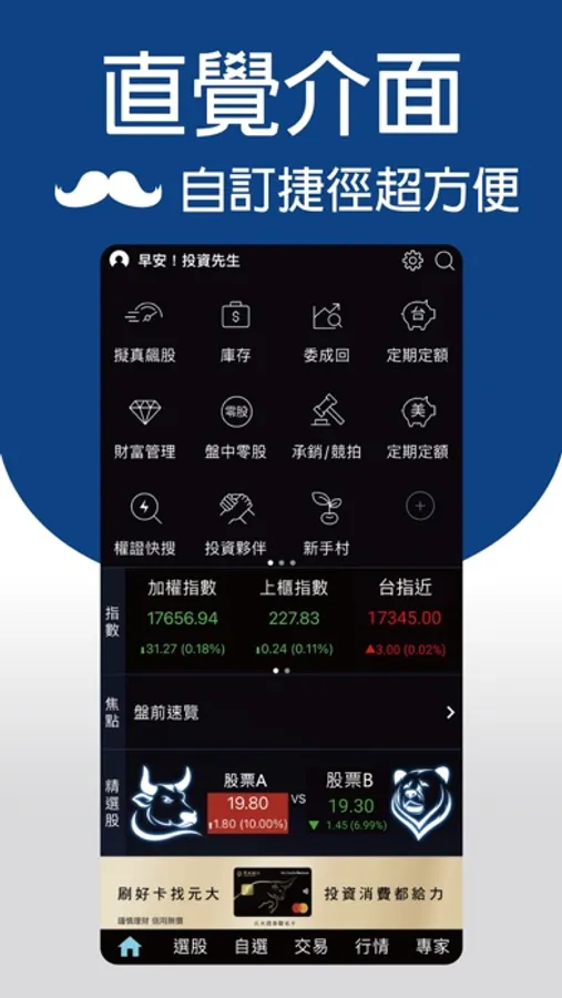 投資先生提供完整的證券、複委託、權證、國內外期貨及選擇權等豐富的市場行情。極簡的下單介面,易懂的圖像化資訊,是你投資的最佳管道,讓投資就像生活一樣簡單!