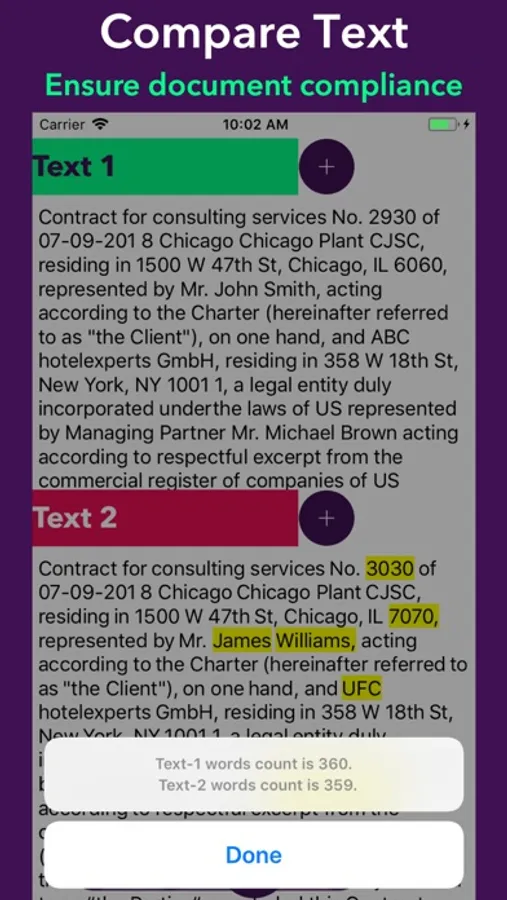 Contract compares two files and instantly highlights differences between them. This allows you to quickly see changes that were made between the original document and a version under consideration, and decide whether or not they should be included before going to the next step in your workflow.