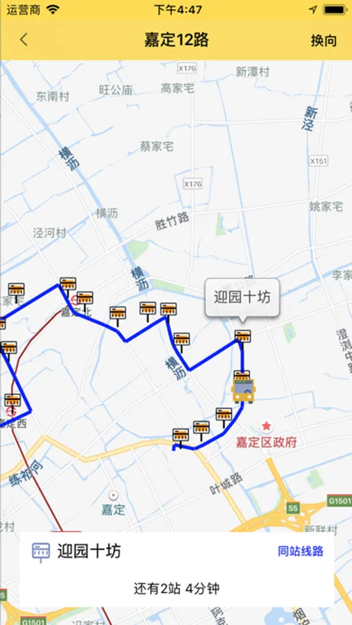 周边公交:可查询周边嘉定公交线路站点的距离,以及站点上经过的线路。可跳转到实时公交查询实时信息。