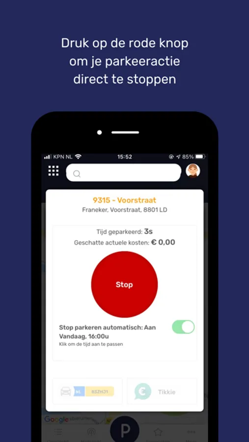 Start vervolgens eenvoudig jouw parkeeractie door op de groene knop te klikken. Wil je dat de parkeeractie op een vaste tijd stopt? Dan kun je dit van tevoren aangeven.