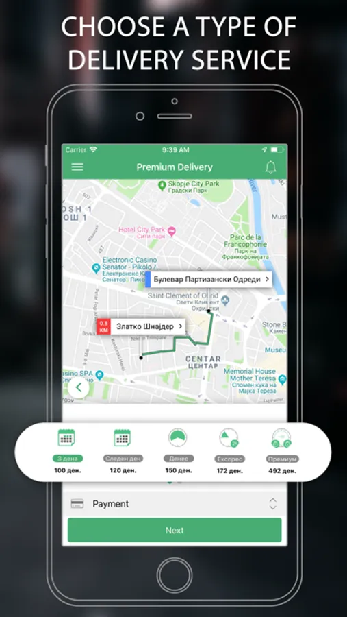 Се избира локација (адреса) за преземање на пратката и локација за достава и се обезбедуваат сите неопходни детали во врска со примачот на пратката