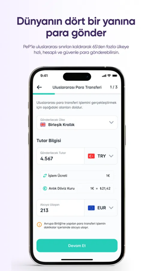 Gökyüzünü sınırsız yap, PeP ile dünya çapında para gönder! 65 ülkeye hızlı, hesaplı ve güvenli para transferleriyle sınırları kaldırın.