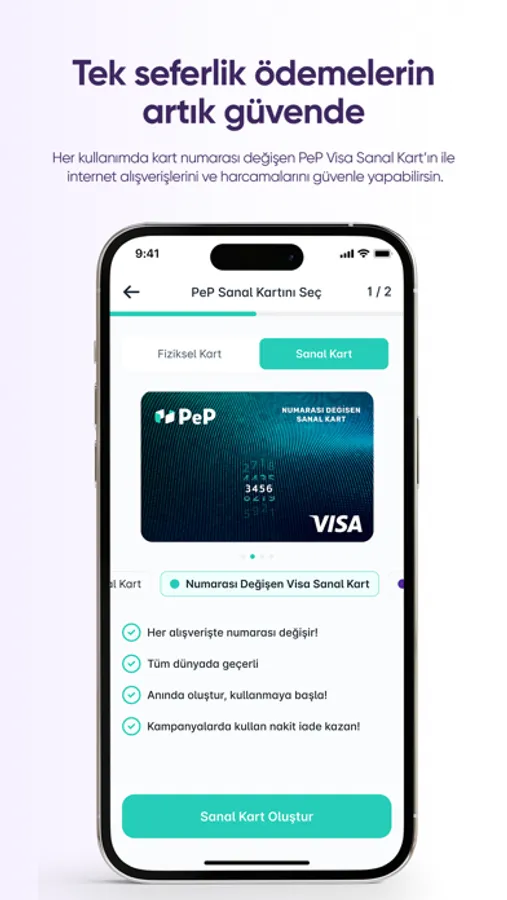 PeP Visa Sanal Kart ile alışverişte özgürce hareket et! Her işlemde farklı kart numarası ile internet alışverişlerini güvence altına al. Online harcamalar hiç bu kadar güvenli olmamıştı!
