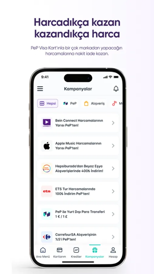 PeP Visa Kart'ınla harcarken kazan! Birçok ünlü markada yapacağın alışverişlerle nakit iade kazanma şansını yakala. Harcadıkça kazandıkça harca!