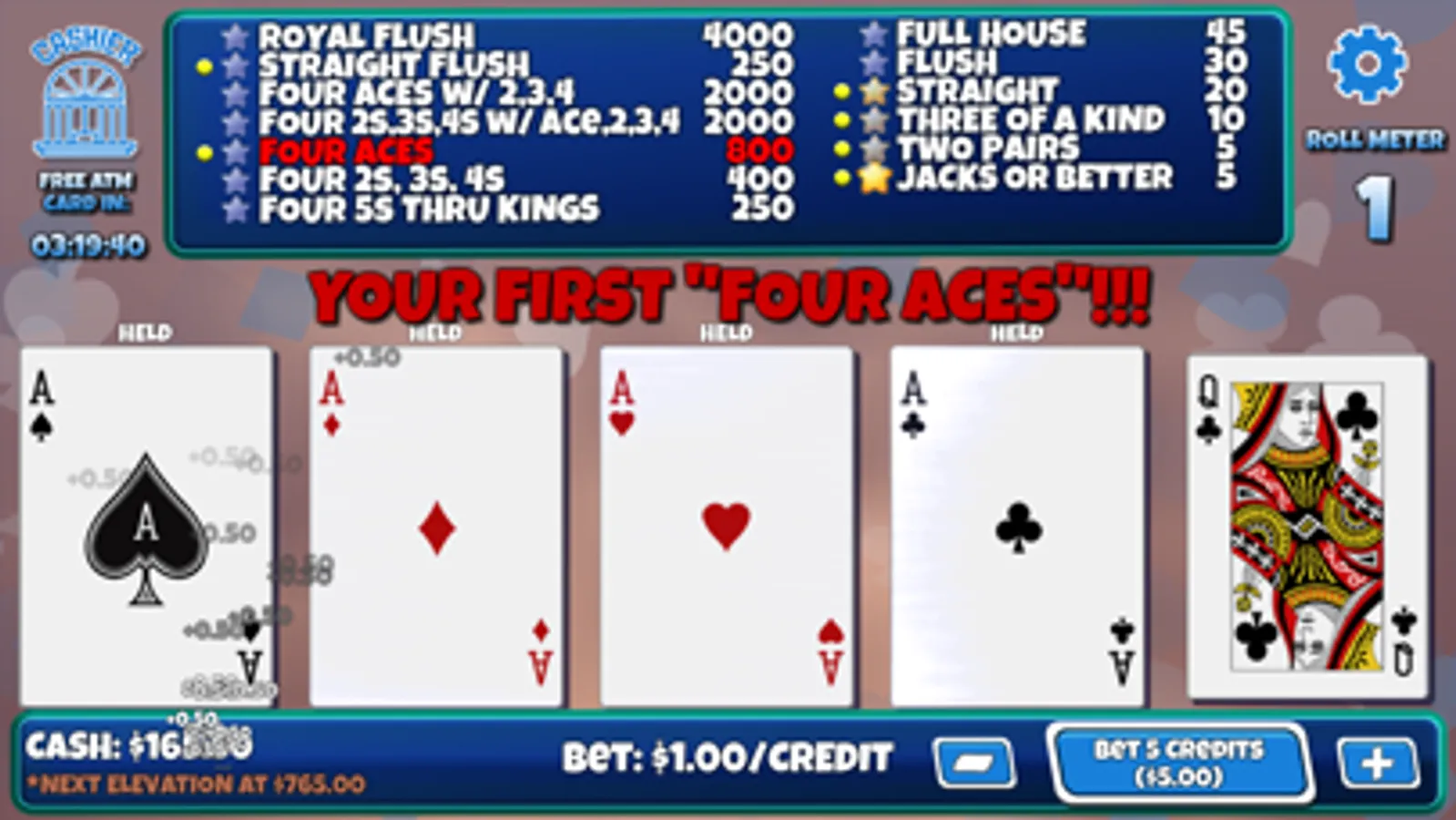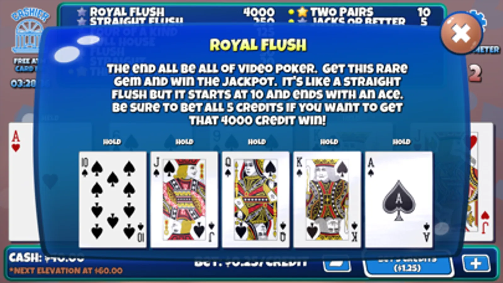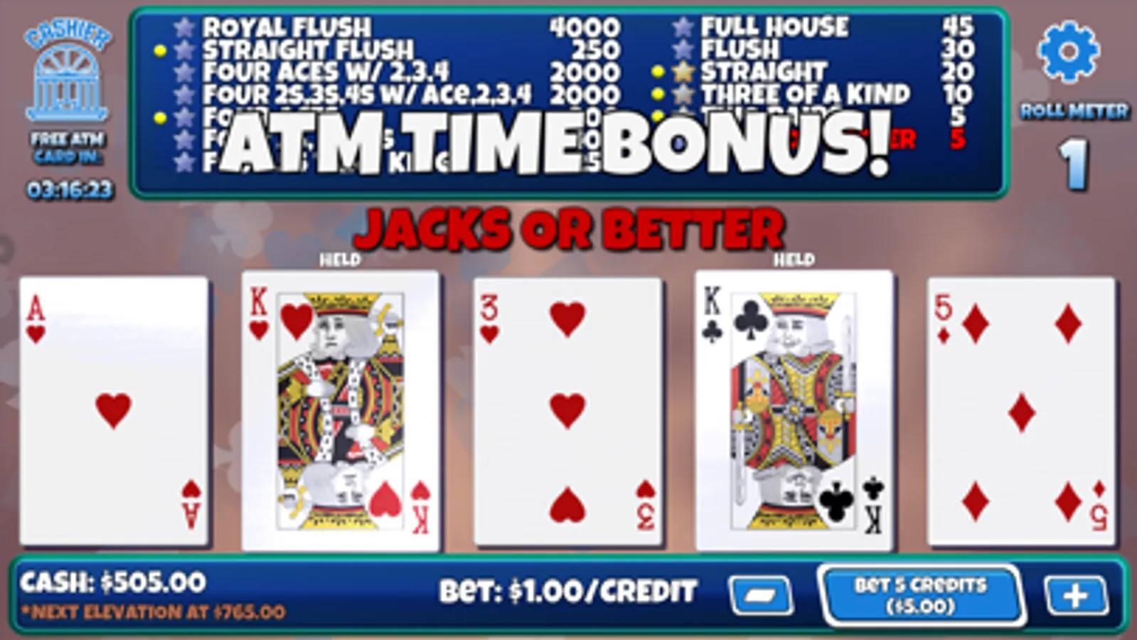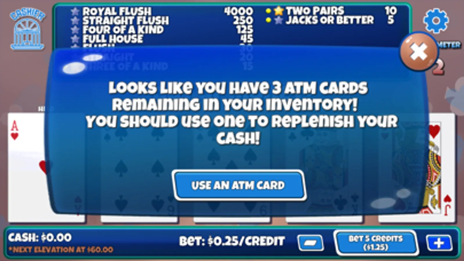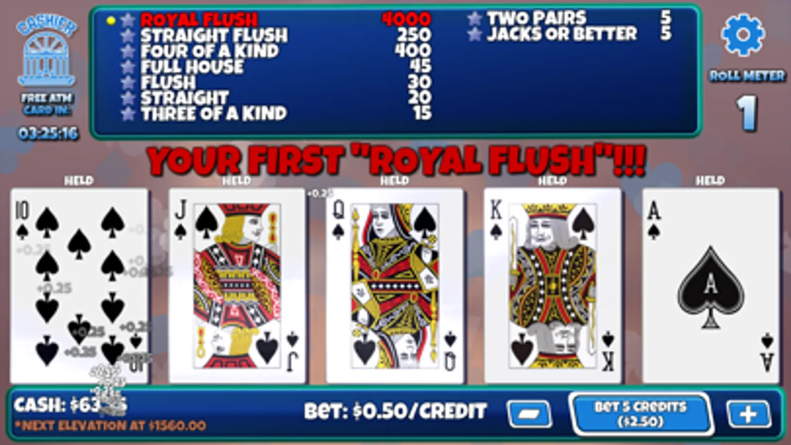 Win big in your quest to get the rare and wily Royal Flush! We’ve worked hard to provide a fun and engaging game that you can play without constantly feeling nickeled and dimed. Use your in-game "ATM Cards" to get cash used to play. These cards are freely available and NEVER run out or expire. You can literally play this game for hours without having to wait for timers or be compelled to purchase something.