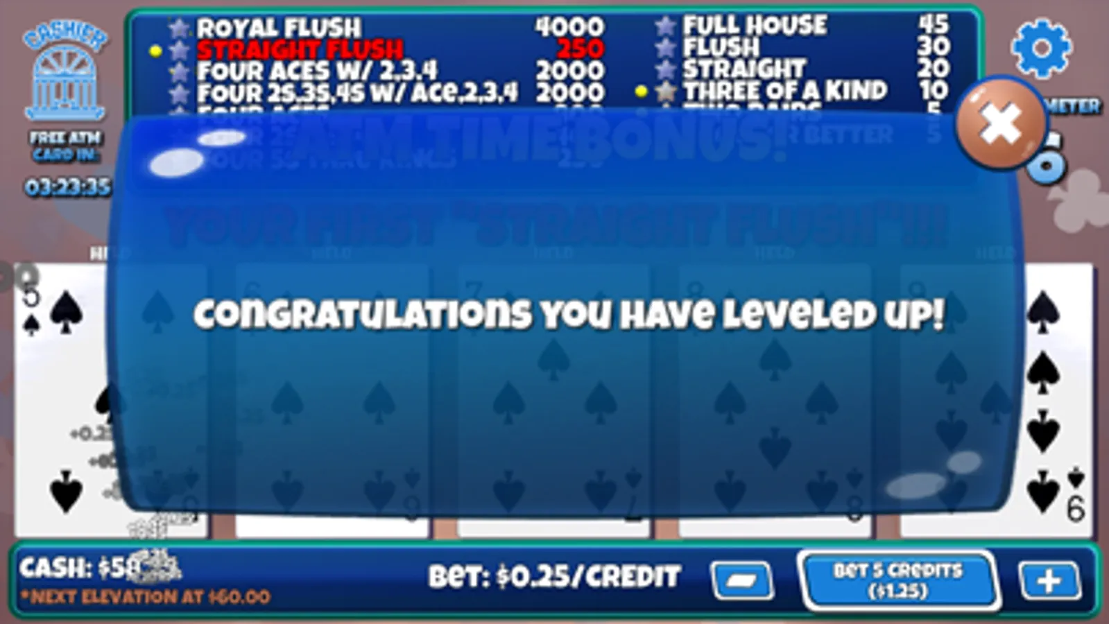 • Level up feature that provides more fun as you progress. Achieve higher levels and bet higher amounts! Even your "ATM Cards" give you more cash as you progress.
