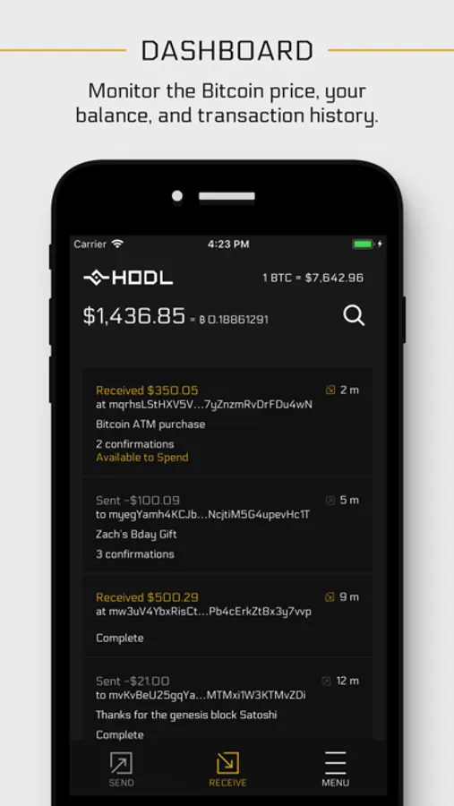 HODL Wallet is a Bitcoin wallet that makes it simple and easy to send, receive, and store bitcoin. It is the best tool for empowering yourself to hold your own funds securely. Your Bitcoin are stored on your device and backed up to a Backup Recovery Key when you create a wallet. This means HODL Wallet can never stop you from accessing or sending your funds.