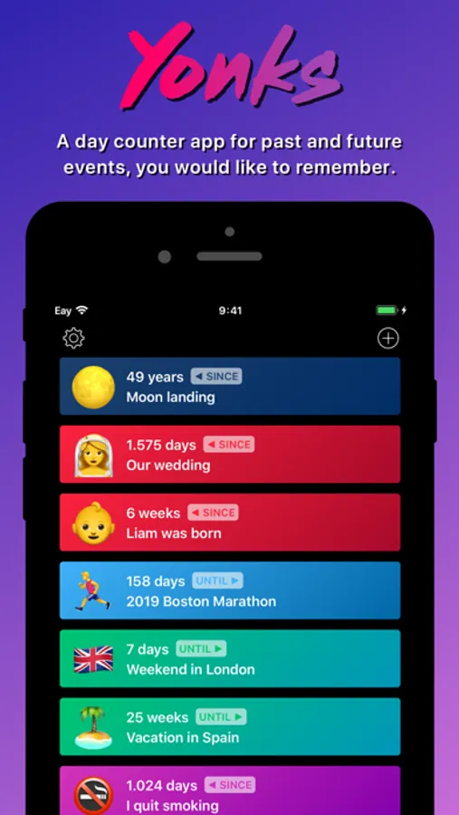 - Suggestions: No idea what to add? Yonks has a growing list of popular counters from a variety of categories (holidays, history, sports, movies, games, ...) for you to add with one tap.