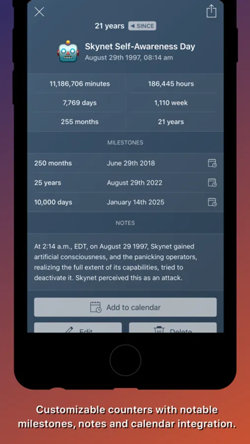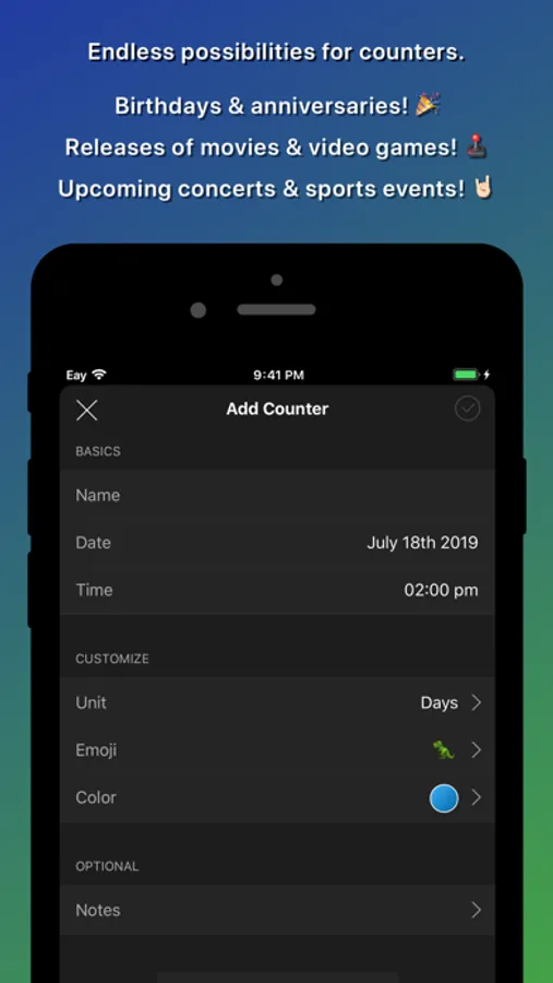 - Notes: Need to remember more than just a date? No problem, just add a custom note to your counter.