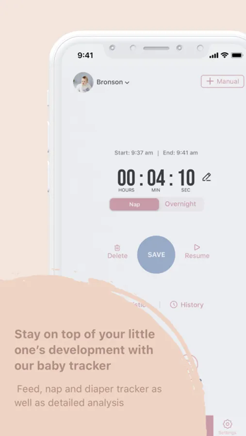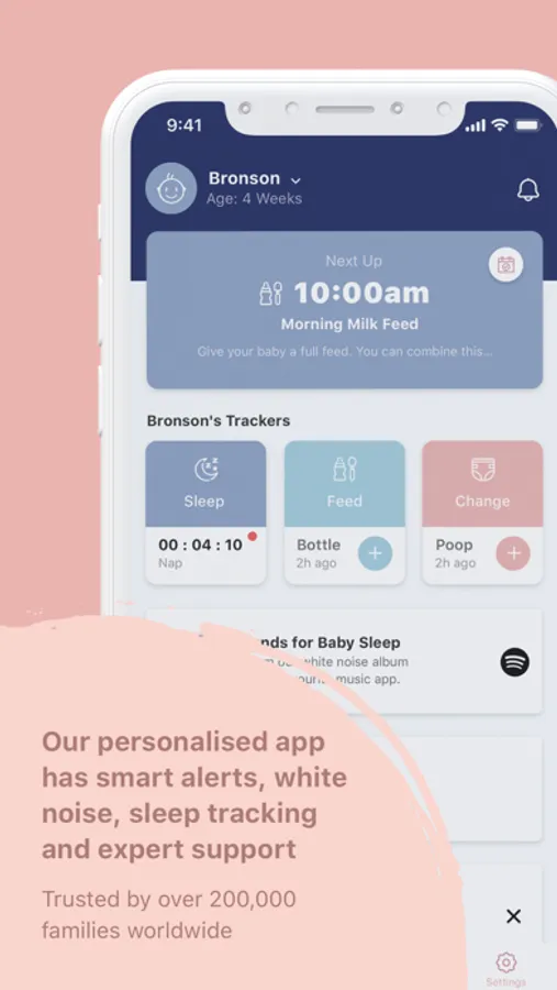 • Sleep, feed, and diaper tracker to record your baby's daily habits