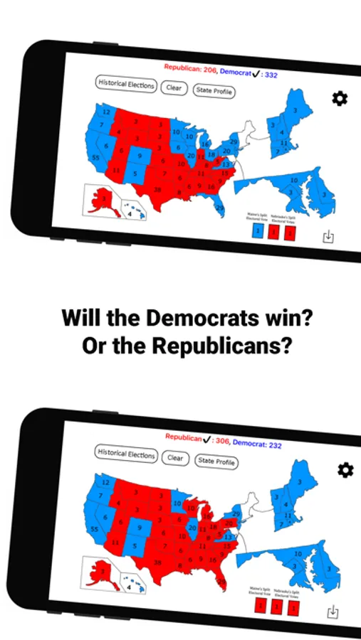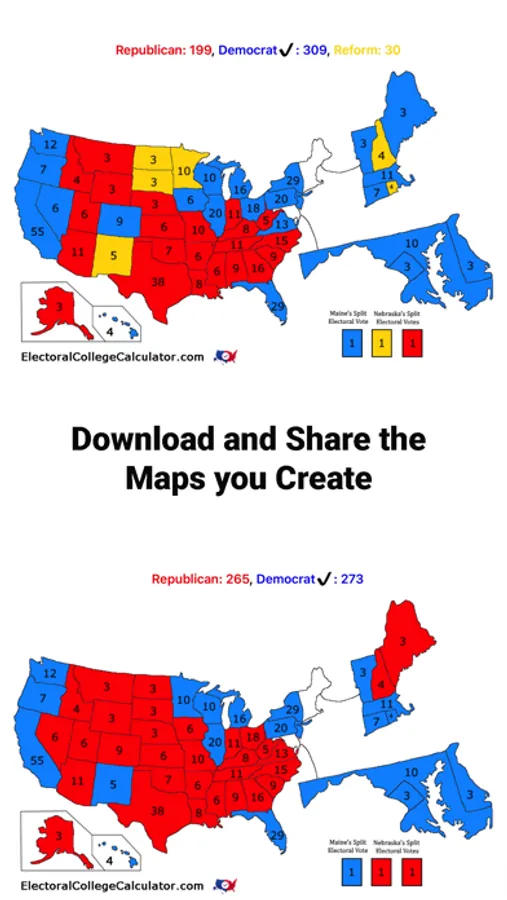 To win a presidential election in the the United States a candidate needs to earn 270 electoral votes. That's a tall order, but now there's a tool to figure out who would win with the right combination of states, right on your iPhone or iPad! All you need to do is tap on a state and that will add it to either the Republican or Democrat's(or even third party's) electoral vote total. You can try all types of state combinations to get to that elusive 270. Simple, fast, and free.