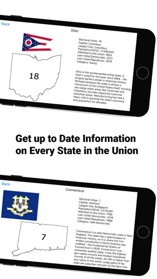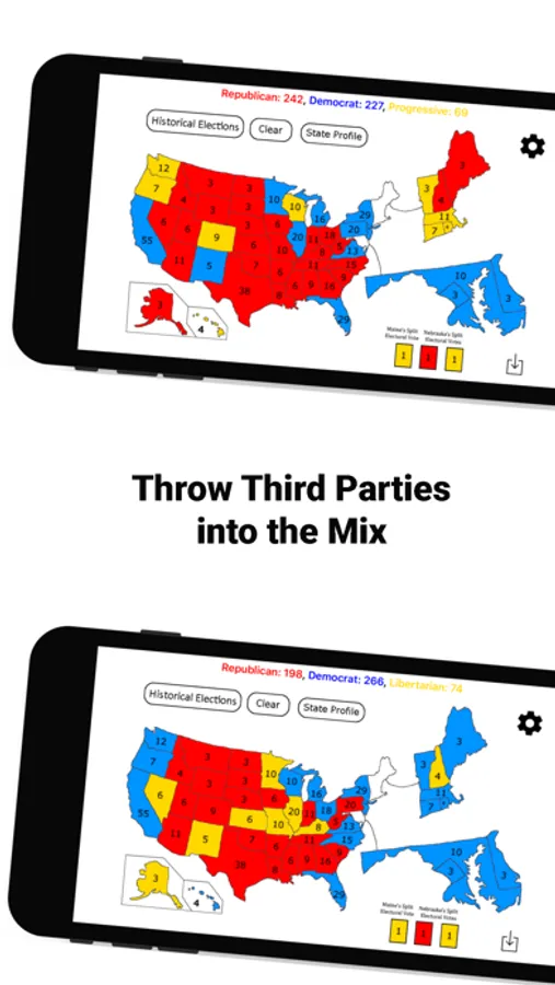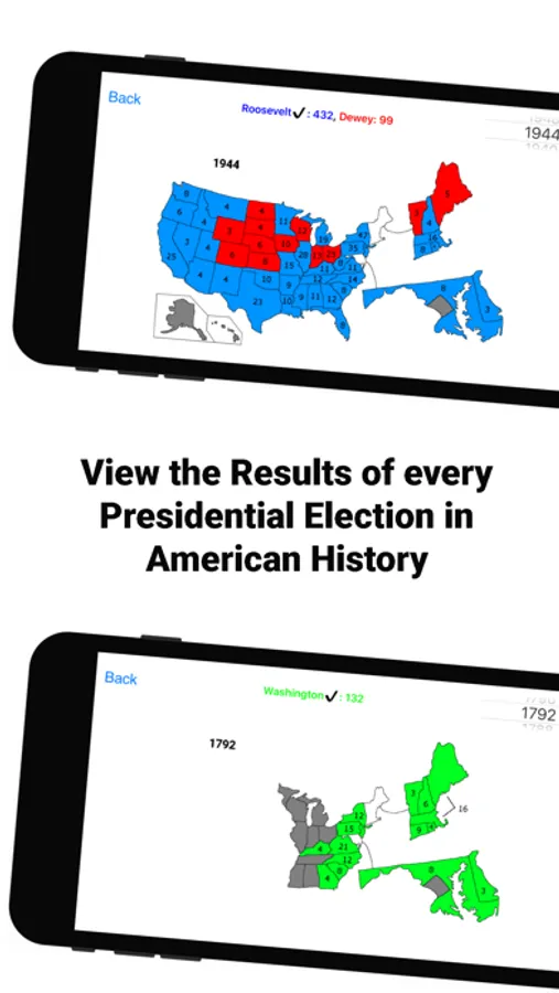 Want to view previous election results? Every election in American history is included in the app. See how close(or not) previous elections were, examine which parties dominated which time periods and regions at different points in American history, and get to know who ran in each election.