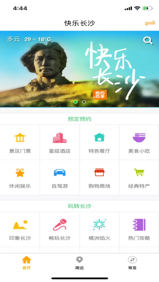 快乐长沙是面向游客进行服务的综合性手机端软件,围绕着吃住行游购娱各个方面,为游客提供全方位服务。