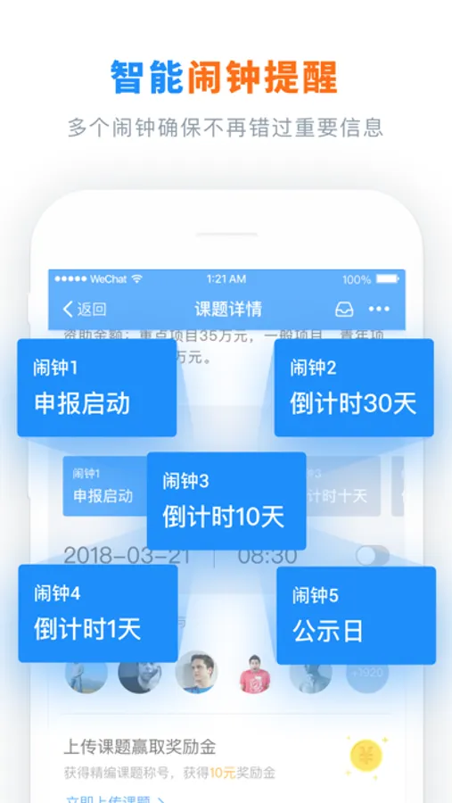 - 智能闹铃,多段提醒,持续跟踪课题、会议和竞赛;