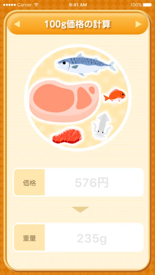 The price per 100 g of meat or seafood may not be displayed. Using this calculation mode, you can easily find out the price per 100 g by simply adding the price and the total weight.