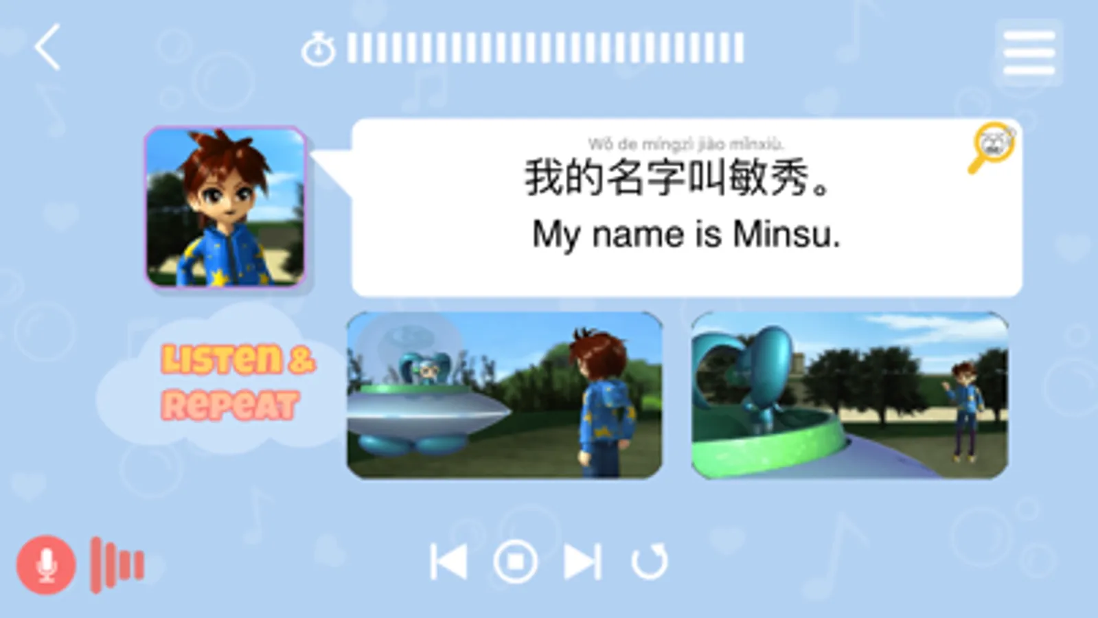 This learning program is designed to listen to five different languages in English, Chinese, Japanese, French and Spanish as a 3D interactive speaking training program, and to learn the language areas including reading and speaking.