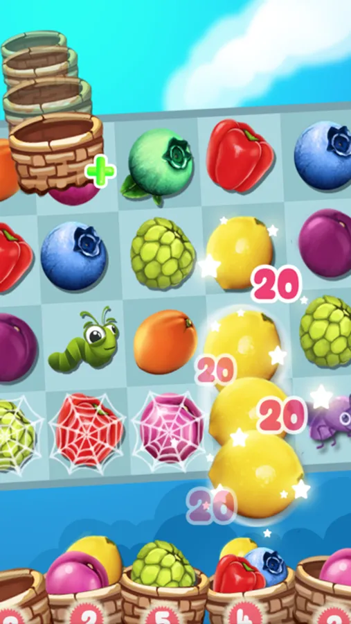 - Combine 5 fruits in a right angle, you can get 5 fruits and bonus two baskets and a fruit that can eat all 9 surrounding fruits