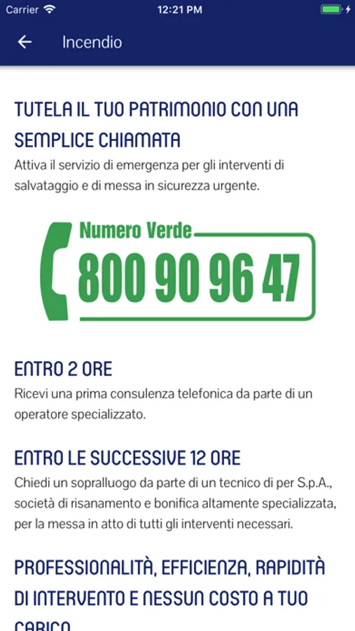 Entro 2 ore dal primo contatto, i Clienti riceveranno una prima consulenza telefonica da parte di un operatore specializzato con le prime indicazioni sui più opportuni interventi di contenimento e salvataggio da porre in atto. Entro le successive 12 ore, potranno chiedere un sopralluogo tecnico da parte di società di risanamento e bonifica altamente qualificata, volto ad approfondire la situazione e ad organizzare tutti gli ulteriori interventi di più immediata necessità per contenere il danno materiale e mitigare gli effetti dell’evento.
