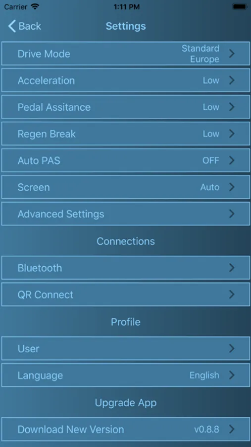 You can adjust your favourite settings on "Advanced settings" section where you can modify "acceleration" , "pedal assistance ratio", "voltage"...etc