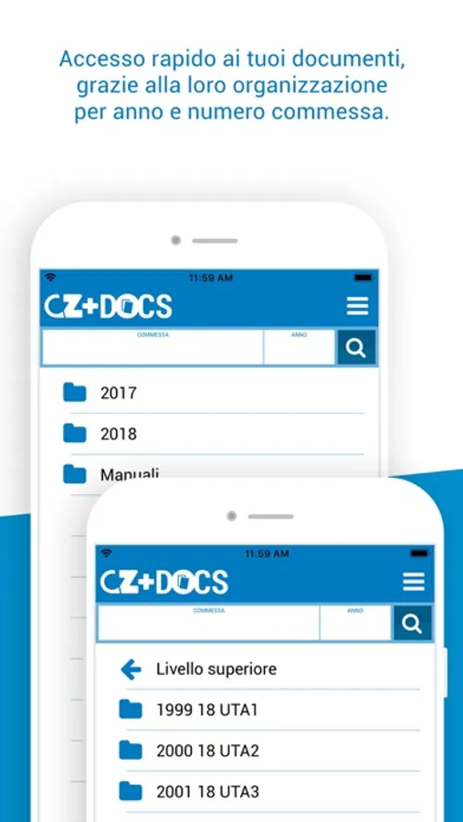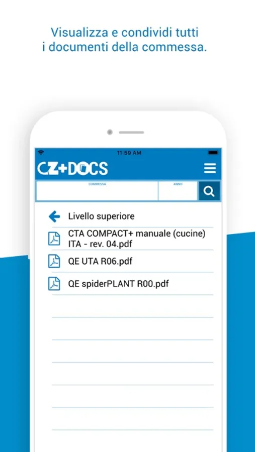 Visualizza e condividi tutti i documenti dei tuoi progetti, organizzate per numero commessa ed anno. Oltre alla navigazione tra le cartelle, potrai effettuare la ricerca anche direttamente tramite il numero e anno della commessa.