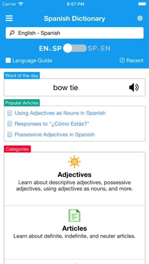 "The best free Spanish dictionary available in the app store!" Featuring the highest quality English-Spanish dictionaries and a Word of the Day. Use it as a handy reference tool and translator or as a fun way to learn new words in Spanish.