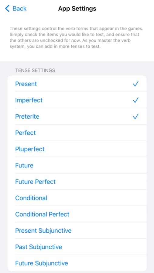 In the settings, you can select which tenses to drill in the games. So whether you're a beginner, or already on the way to mastery, there's a level for you!