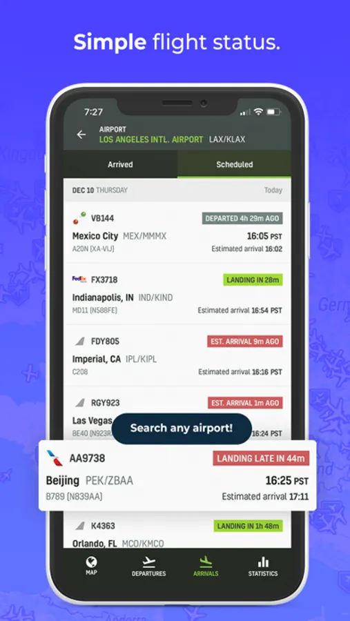 - Know all arrival and departure flights of any airport and it's status: if it's delayed, still in flight, in taxi and any status information provided by the airplane squawk code.