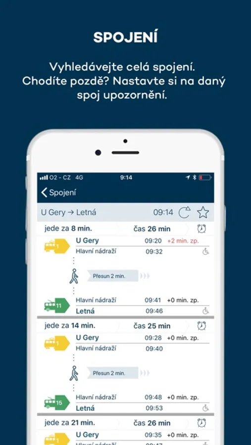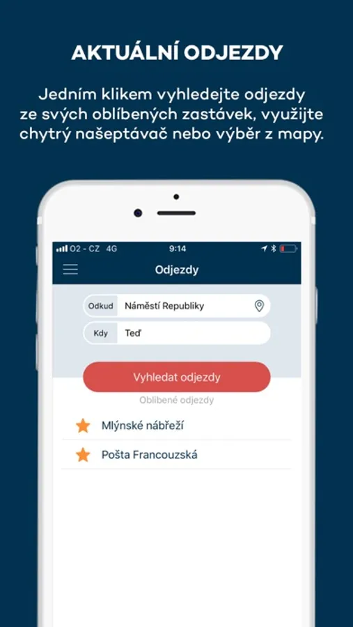 Vyhledávejte odjezdy linek ze zastávky či celé spojení, časy budou vždy aktuální, včetně případného zpoždění. Pro pohodlné každodenní cestování MHD si uložte zastávky do oblíbených, nebo si jednoduše vyberte z těch nejbližších.