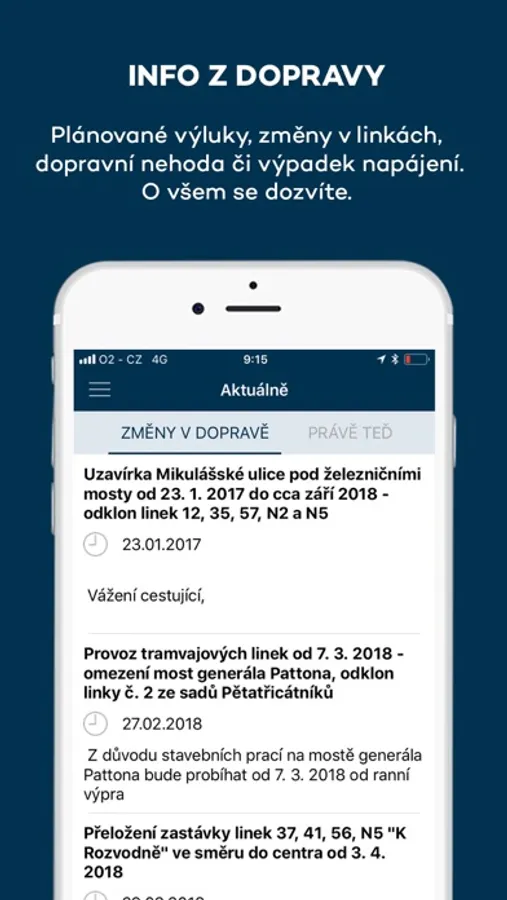 V aplikaci vás upozorníme na dopravní nehody nebo jiné události, u kterých hrozí delší zpoždění našich vozů. Aby vás tyto zprávy neobtěžovaly, můžete si nastavit zasílání upozornění jen pro vaše oblíbené linky. Dále se dozvíte i o všech plánovaných změnách v dopravě.