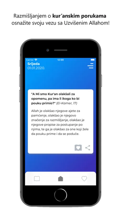 Jednostavna, funkcionalna i svrsishodna aplikacija koja će vas navesti na razmišljanje o korisnim kur’anskim značenjima iz svakodnevnog života.