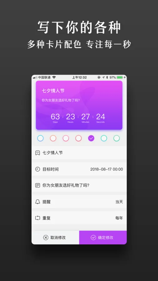 选择一个你关注的节日或创建一个即将到来的目标日期,秒级别的倒计时展示你的目标时间。