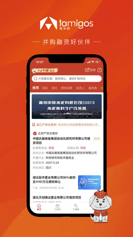 “塔米狗”企业并购融资信息服务平台,是基于全网并购融资项目与资讯,通过用户行为分析智能算法,实现并购融资信息精准推送,并购融资服务机构精准推荐,实现并购信息与在用户之间的有效匹配,降低业务成本,提高并购融资效率。同时也是并购融资服务机构高效展开业务,服务投资人、项目方的有效工具。