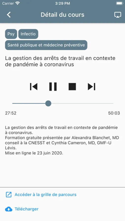 Idéale pour les déplacements ou encore en parallèle à une autre activité permettant l'écoute active. A noter que la simple écoute ne vous donnera pas de crédits de formation, mais que vous pourrez compléter le parcours intégral obligatoire sur Caducée pour bénéficier des crédits et de l'attestation de participation.
