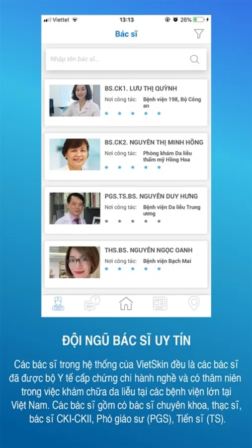 - Đội ngũ bác sĩ uy tín của VietSkin là các bác sĩ lâu năm kinh nghiệm tại bệnh viện da liễu lớn của Việt Nam - Tuyến cao nhất trong hệ thống bệnh viện tại Việt Nam.