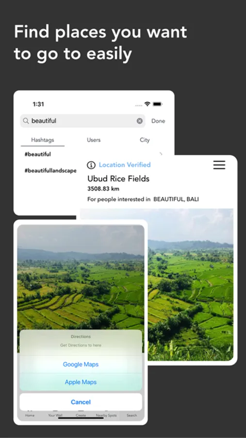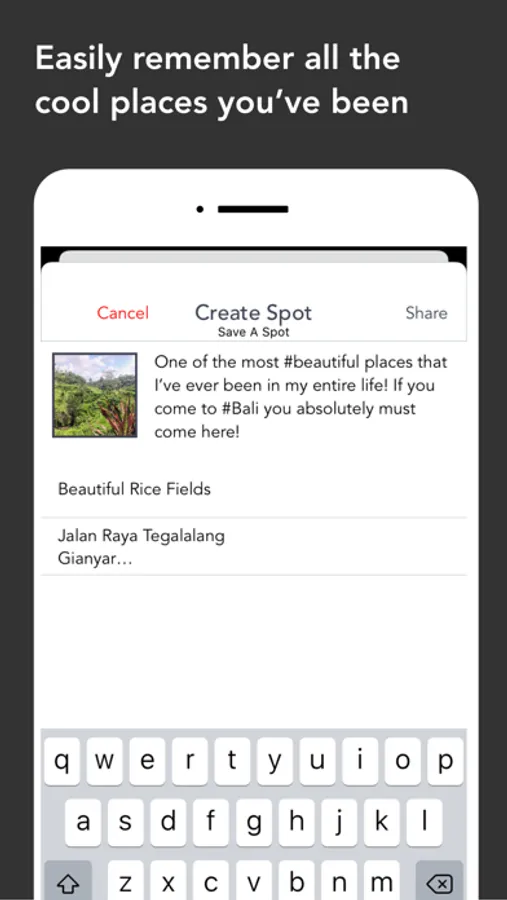 - Search Bali, to find cool places in Bali, and then save those spots. Now when you're in Bali, you can easily navigate to all those cool places.