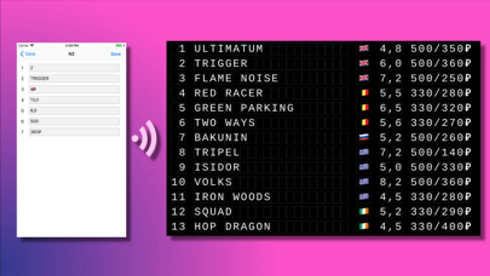 This app allows you to use your device as a video source for an external display (TV, projector, screen, etc.). Just connect an external display to the device via AirPlay or 'Lightning to HDMI' adapter and the data will be displayed as a stylish table with a nice flipping animation.