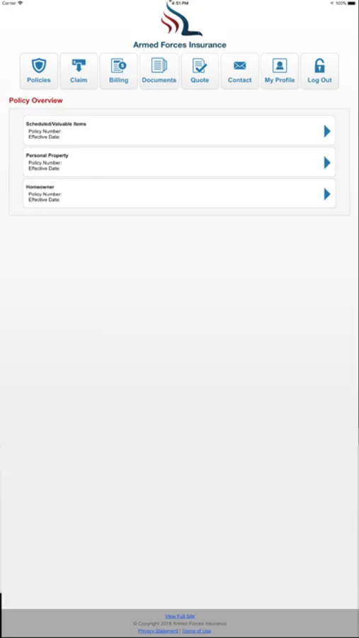 Download the Armed Forces Insurance (AFI) mobile app today to gain quick and easy access to your account information, pay your bill, file a claim, review the progress of your claim, and much more. AFI was founded in 1887 by military leaders with a single mission: to protect the property of those who protect our nation. We know you and the challenges you face every day. This app is yet another way we are delivering services tailored directly for you.