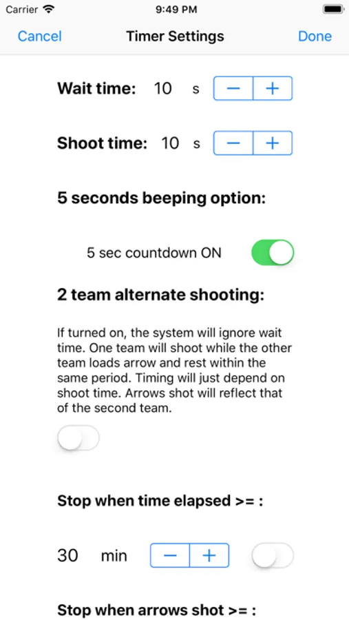 The Archery Fit app provides a specialized archery timer clock for interval training drills meant for amateur, intermediate and elite archers. You can choose different waiting time and shooting time to fit your own personalized drill. The app also supports alternate 2 person/group training and allows automatic stop of the timer when the user's targeted arrows or practice time is achieved. Features such as sound control, display of number of arrows shot and total elapsed time are also included. For normal competition timings, please check out the Archery Clock app instead. For iPhone and iPad.