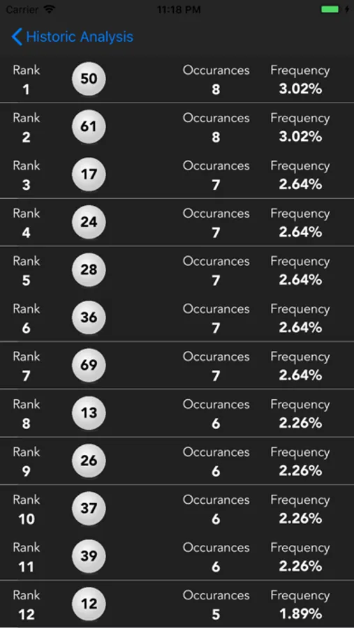 ** Listing of all winning white ball and Powerball occurrences over the last 10 years sorted according to frequency (viewable in different time frames).