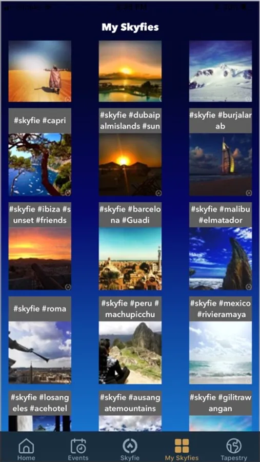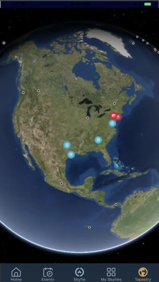 Sky Tapestry is a fully interactive digital globe that shows Skyfies, content, from individuals worldwide in near real-time. The Sky Tapestry renders the Skyfies on a satellite topographical map that can be zoomed to neighborhood resolution. But don’t worry, your identity and specific location are not revealed.